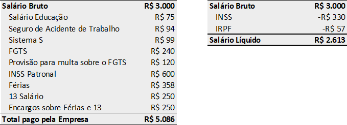 A tabela abaixo mostra os encargos incidentes sobre a folha de pagamento para o caso de um trabalhador que recebe R$ 3.000 mensais.