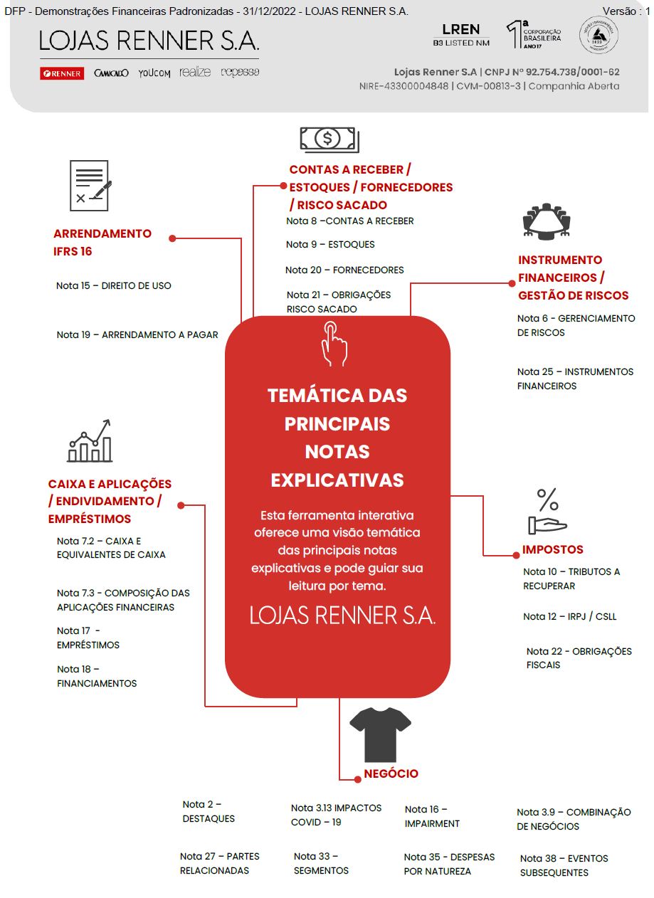 Na imagem ao lado (clique para ampliar) , vemos um exemplo de ênfase na nota explicativa realizado pela Lojas Renner em seu relatório de 2022. Nela a empresa apresenta um guia visual com a indicação das principais notas explicativas que o leitor de suas demonstrações financeiras deve observar. Caberá portanto ao analista de balanço ler com bastante atenção as demonstrações financeiras e respectivas notas explicativas, buscando identificar possíveis inconsistências nas informações prestadas.