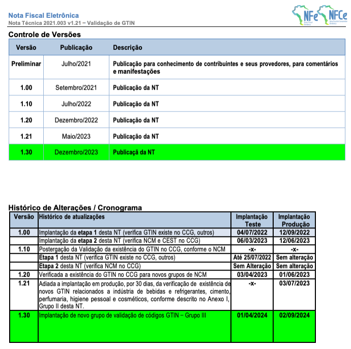 Publicada a NT 2021.003 v.1.30, que amplia a verificação, para os donos de marcas, da obrigatoriedade de informar o GTIN e sua respectiva validação no CCG (Cadastro Centralizado de GTIN), durante a emissão da NF-e, conforme NCM relacionadas no Anexo I, Grupo III desta NT.
