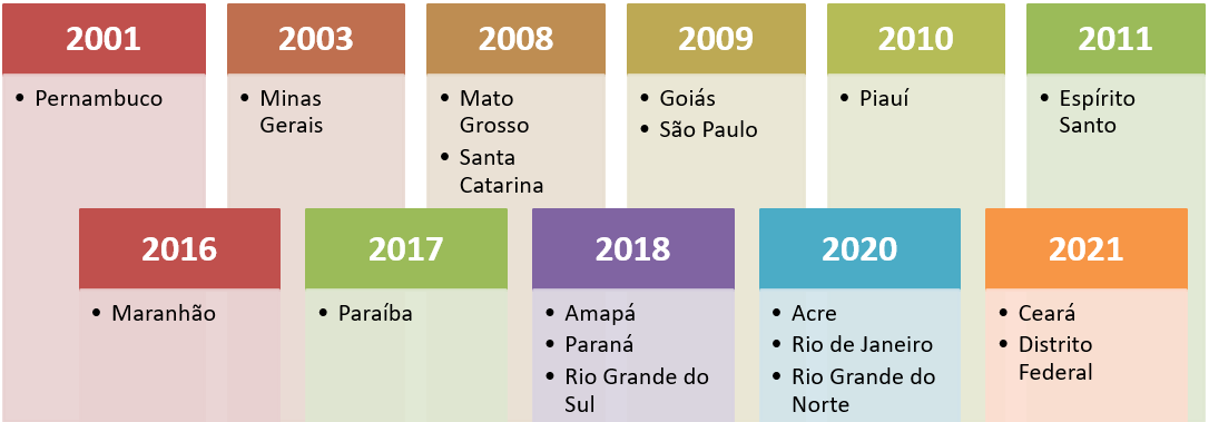 Atualmente a regulamentação já foi realizada apenas por 19 Unidades da Federação. O primeiro Estado a regulamentar foi Pernambuco, e mais recentemente o Ceará e o Distrito Federal. Muito interessante observar que a partir de 2017, ano em que foi criado o Grupo de Trabalho de Auditoria Fisco-Contábil do Encontro Nacional dos Coordenadores e Administradores Tributários Estaduais (ENCAT), houve uma aceleração do aumento de Estados que passaram a regulamentar o acesso aos dados bancários nos termos da Lei Complementar, conforme pode ser observado na time-line a seguir.