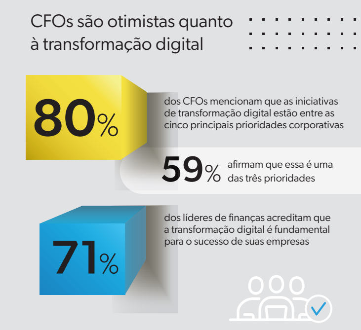 A Dimensional Research, uma empresa independente de pesquisa de mercado, conduziu uma pesquisa global* com 1500 líderes de finanças que revela que os CFOs estão liderando as melhorias digitais para promover o crescimento dos negócios e a transformação. As descobertas da pesquisa indicam que os CFOs e os CIOs precisam, juntos, determinar a viabilidade econômica e o ROI de cada iniciativa de TI e formar parcerias ativas para priorizar as tecnologias certas e investir nelas.
